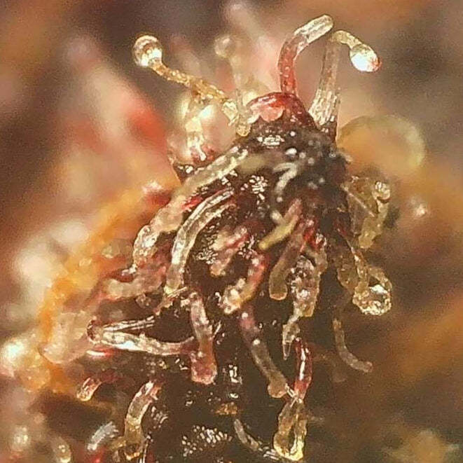 Las colas son alargadas y están cubiertas de resina , mostrando tonos rojos, violetas y morados intensos a medida que maduran. Los pistilos varían del rojo al fucsia , contrastando con el verde brillante del follaje. El aroma combina notas cítricas y de frutos rojos con matices florales y terrosos . A pesar de su origen autóctono, la densidad de resina y la riqueza de terpenos son notables.