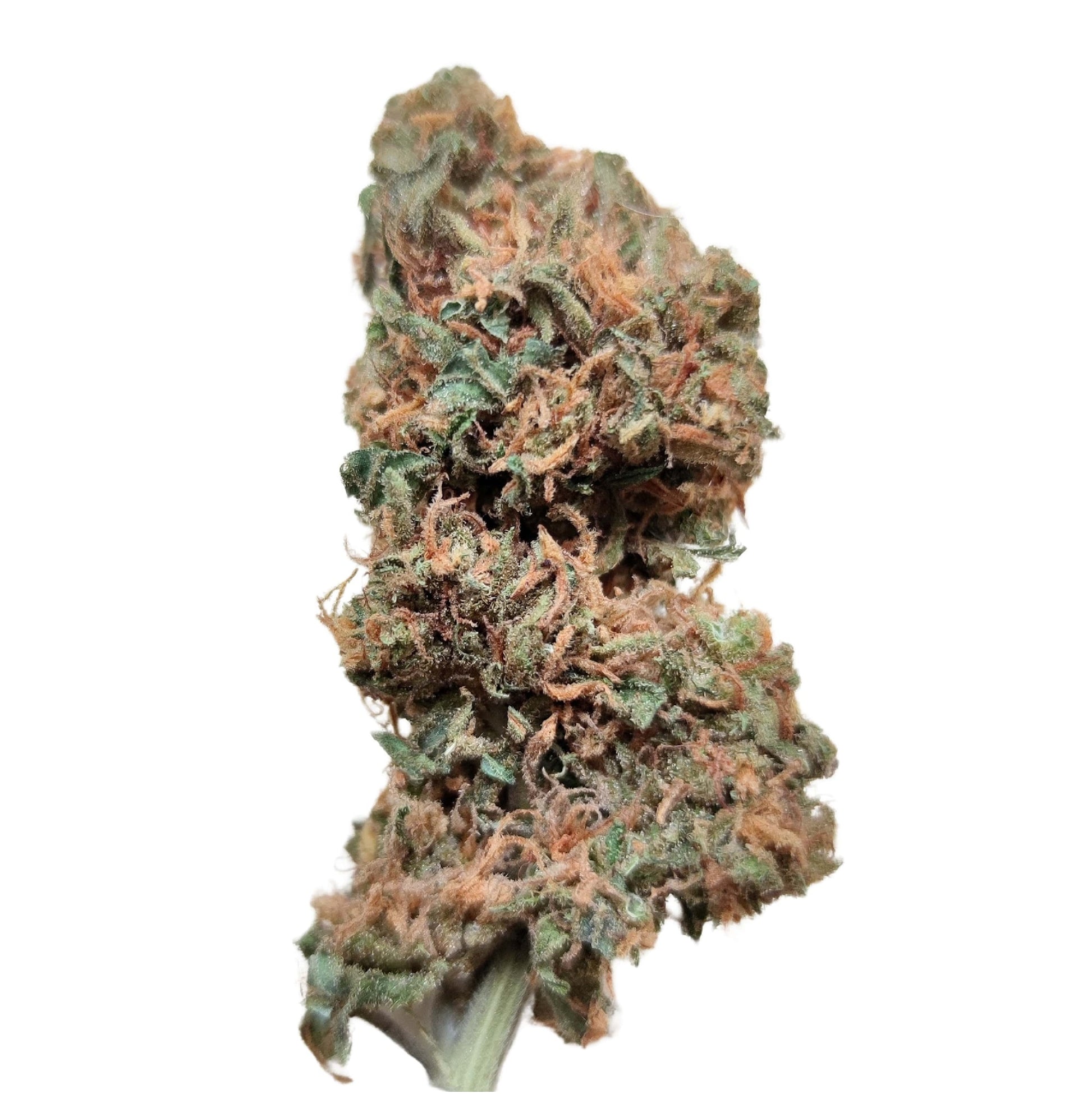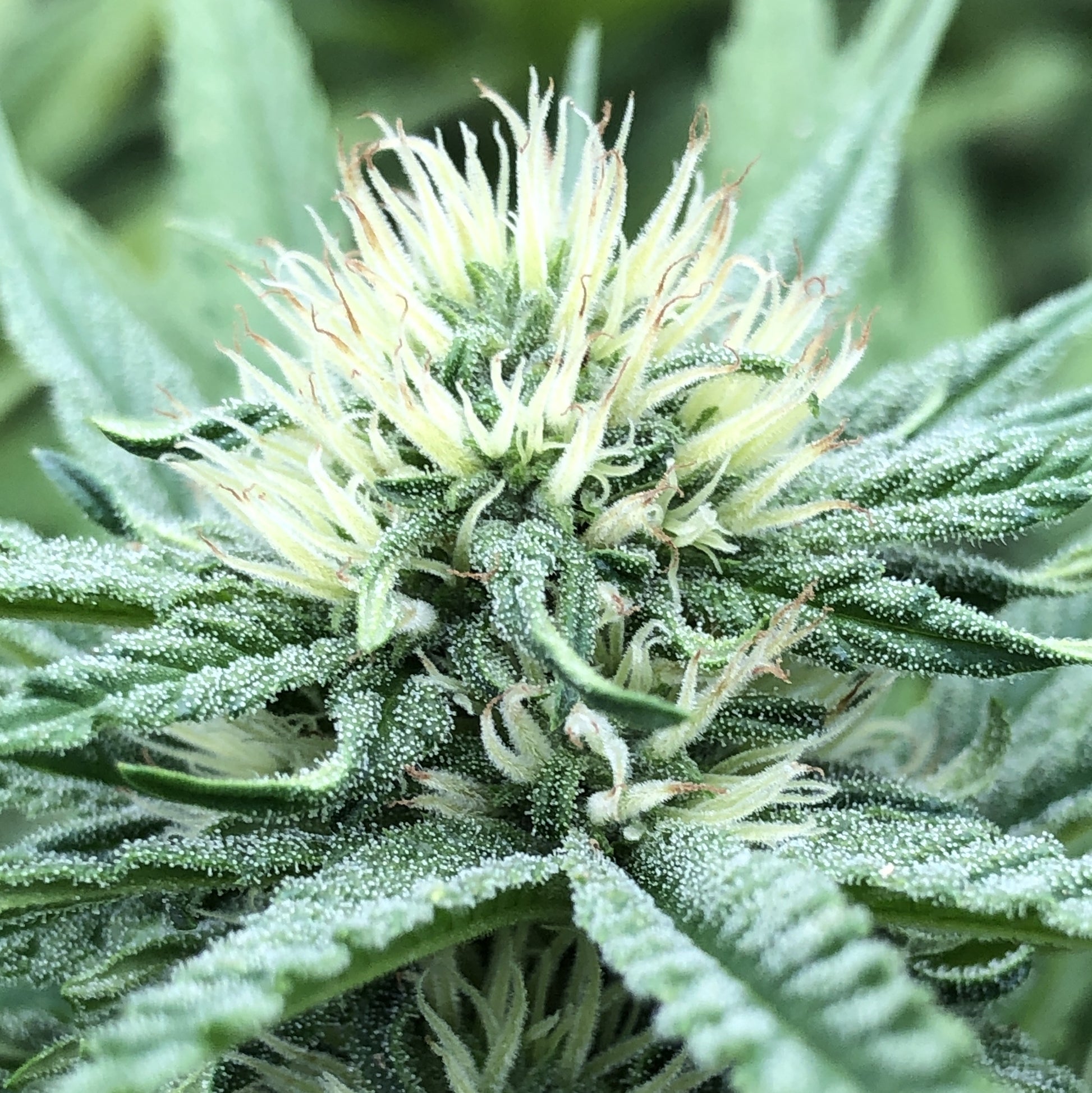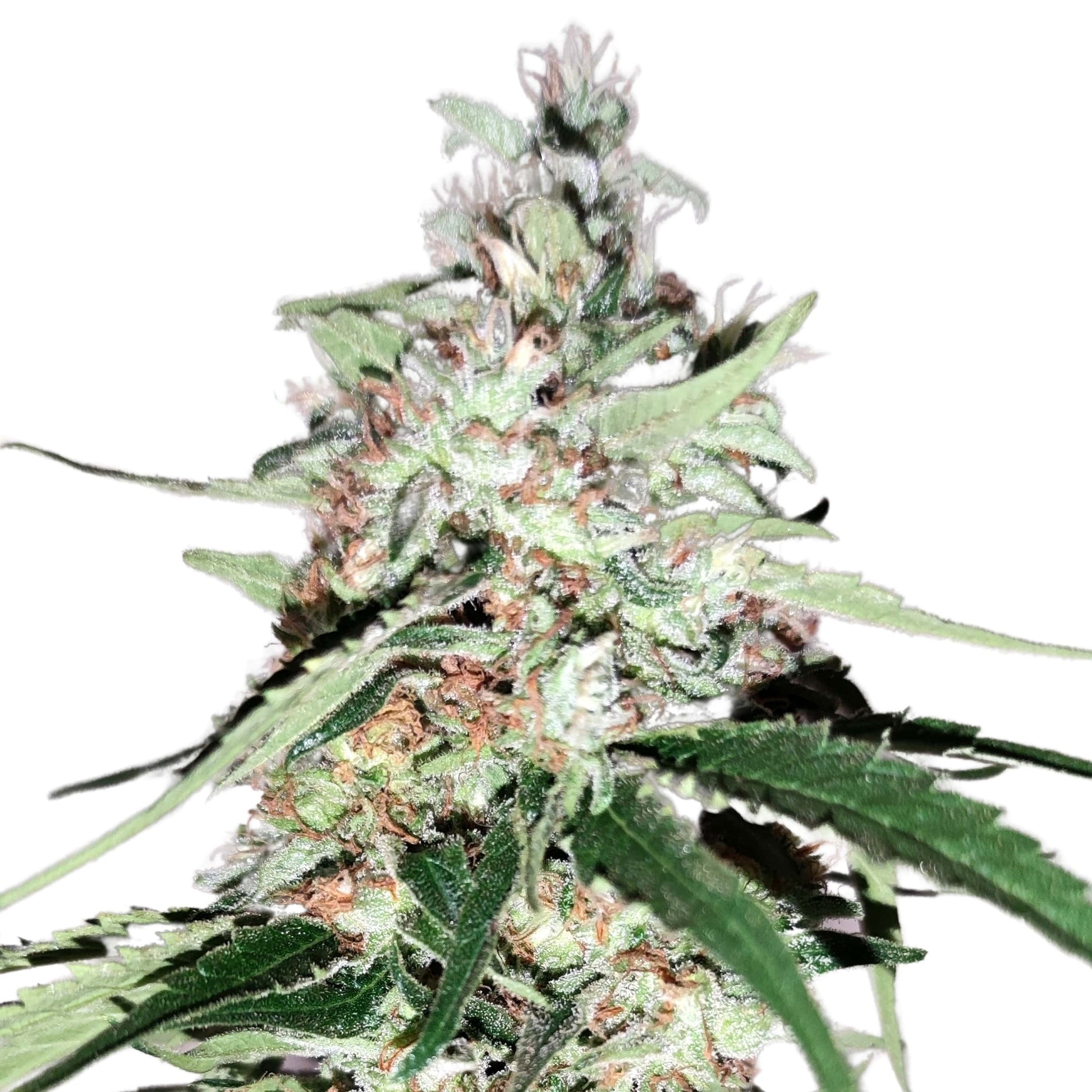 - Produces elongated, resin-rich buds, lime green and covered with orange hairs