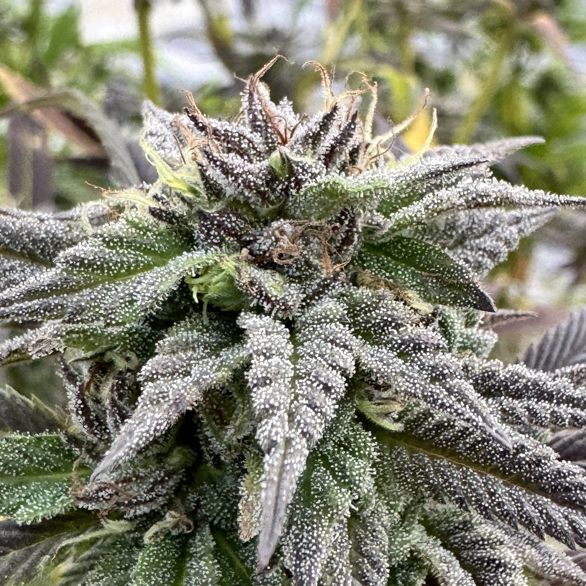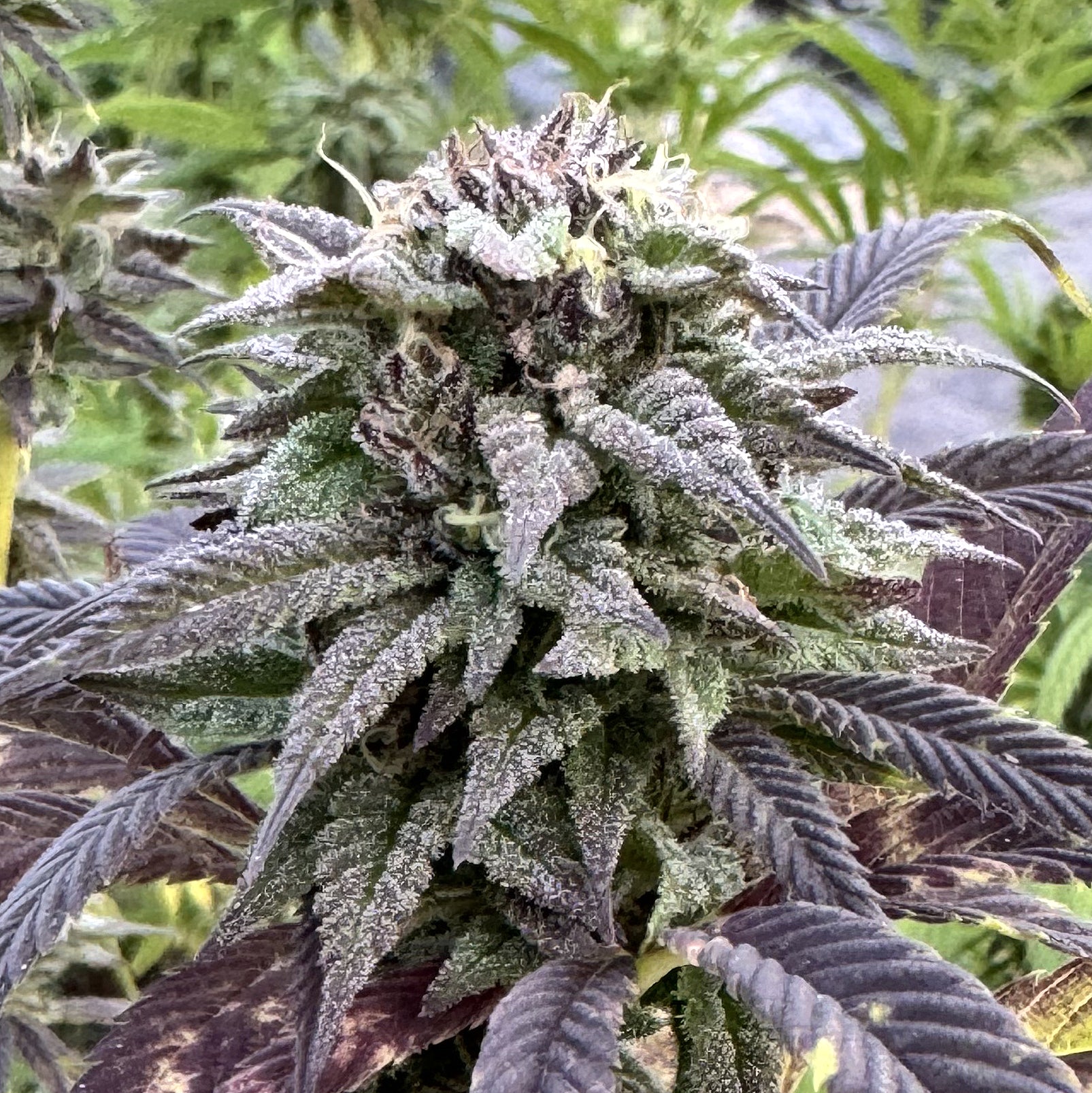Foliage color varies from deep green to purple-black in cooler conditions, with strong anthocyanin development near maturity. Resin production is early and prolific, with bulbous trichomes coating calyxes and leaves by week four. The buds cure into dense, sticky clusters with minimal leaf-to-flower ratio, ideal for traditional or mechanical hash extraction.