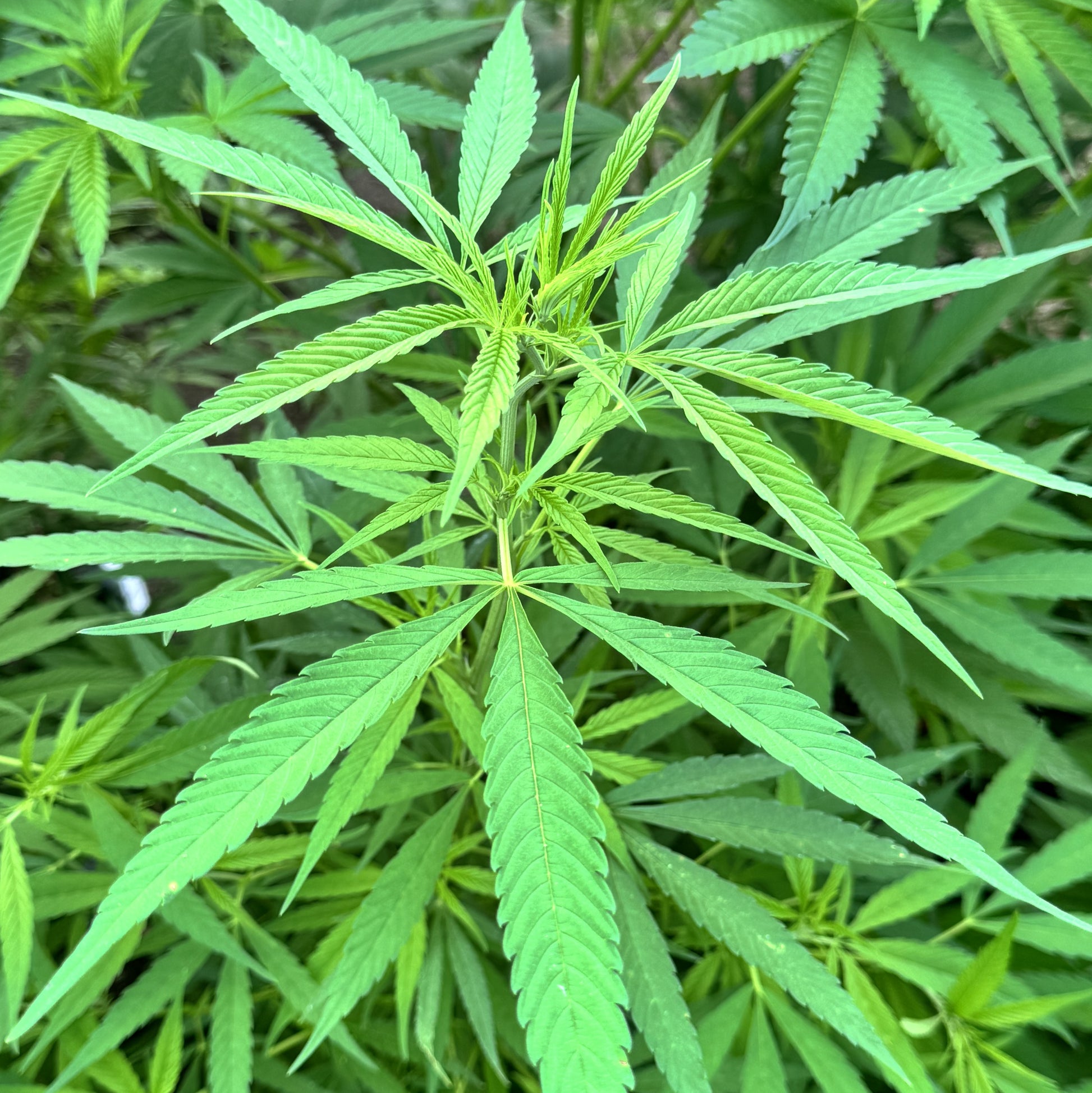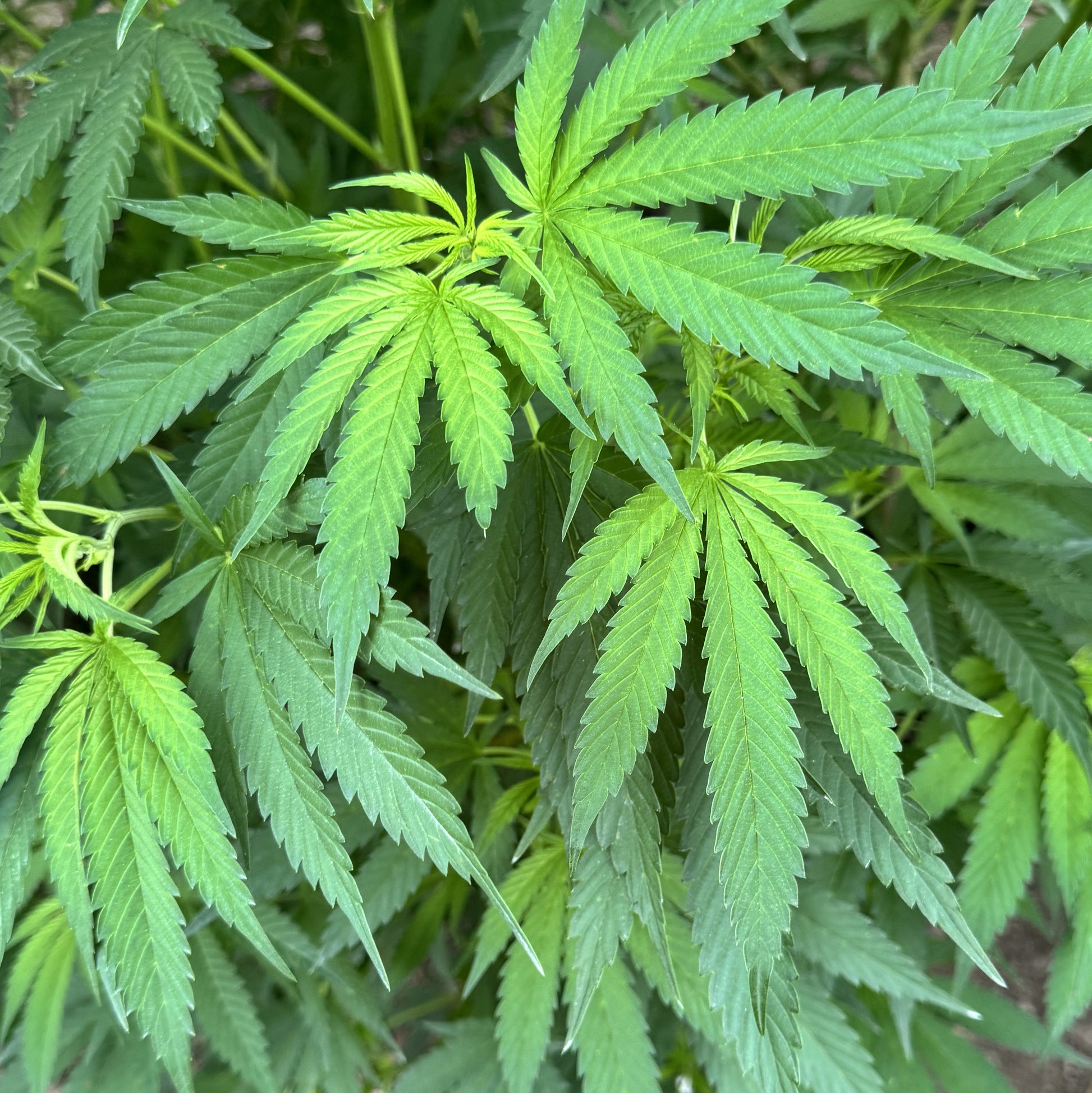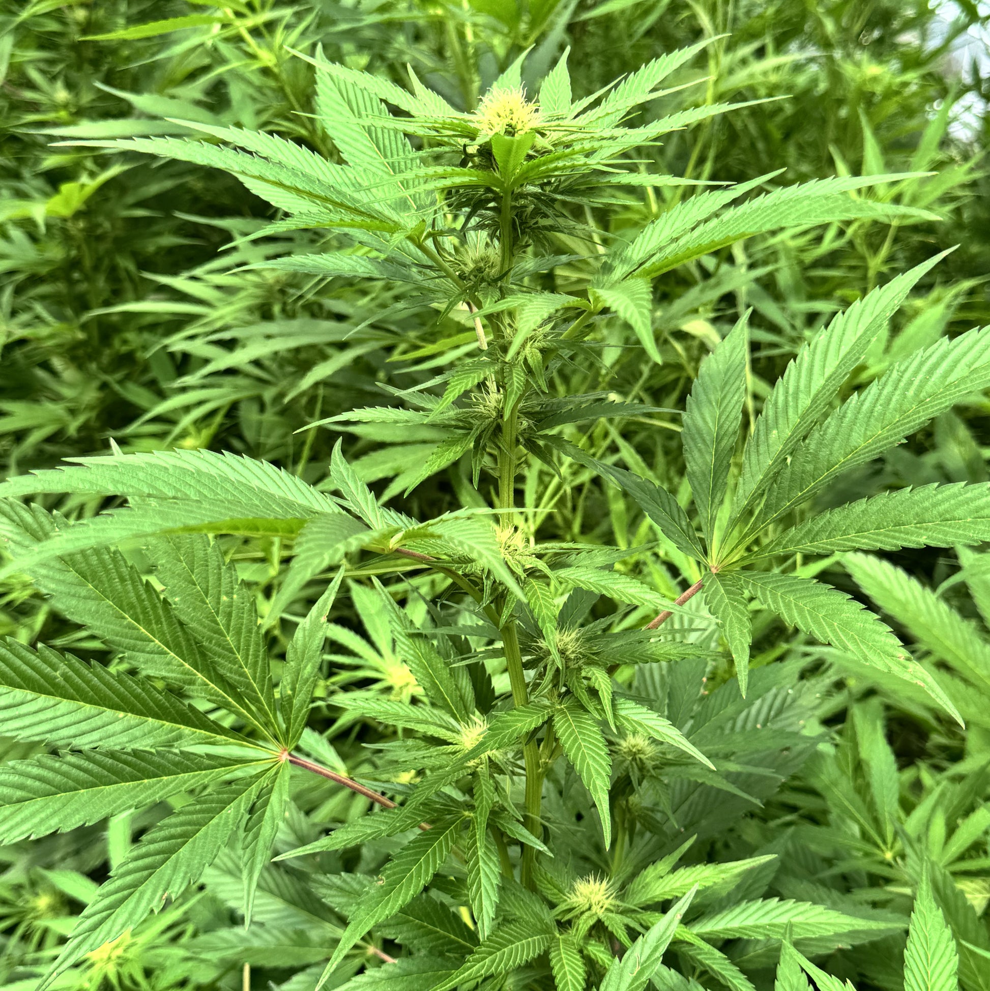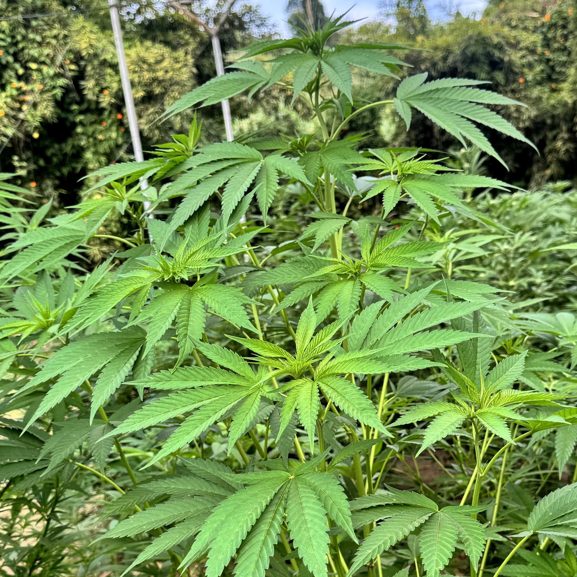 - Tall, open plants with Kona Gold influence: long internodes, narrow 7-blade leaves, and vigorous vertical stretch.