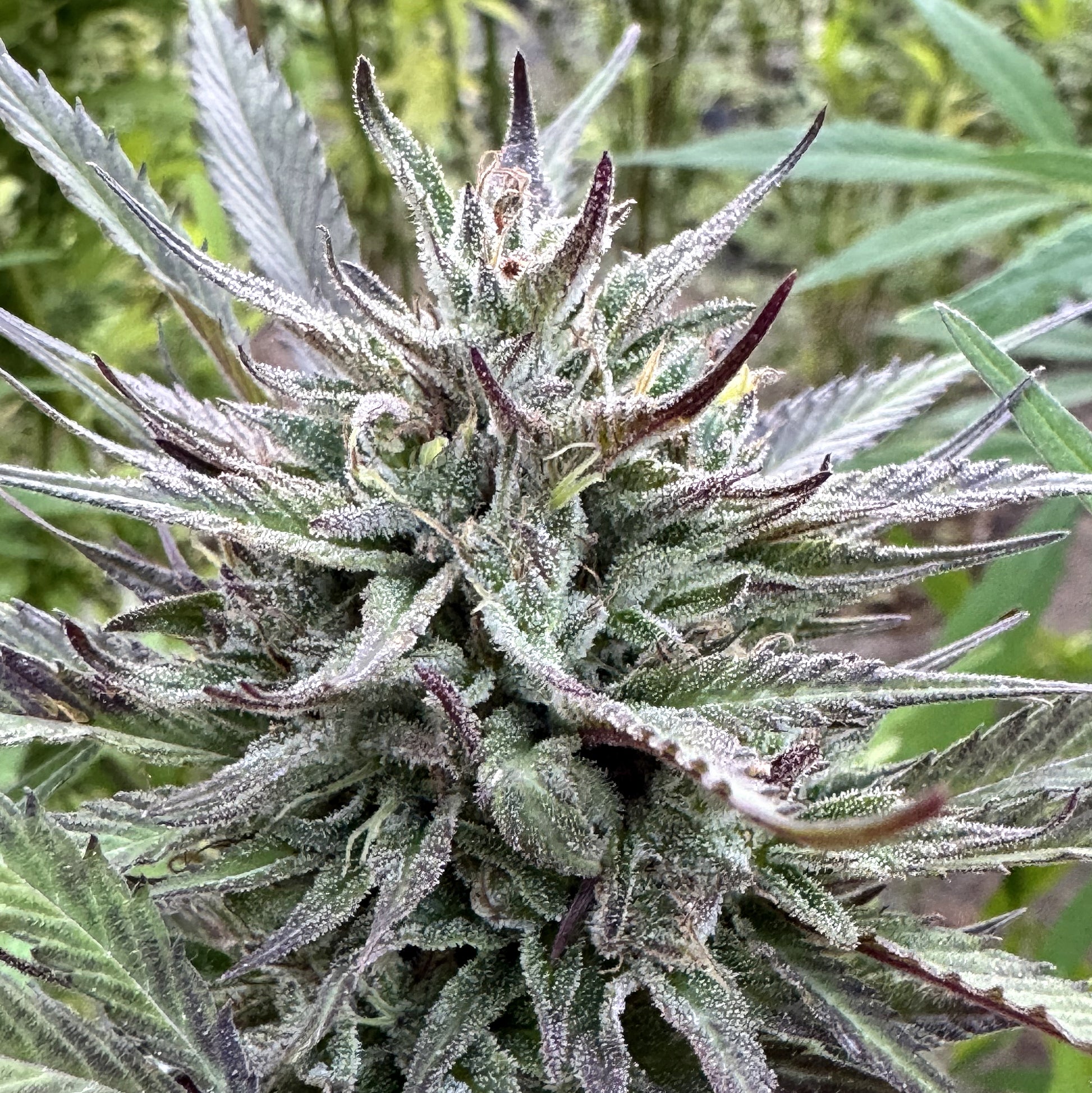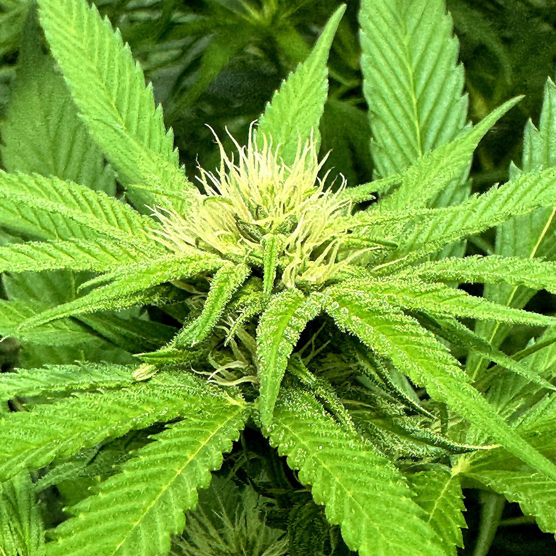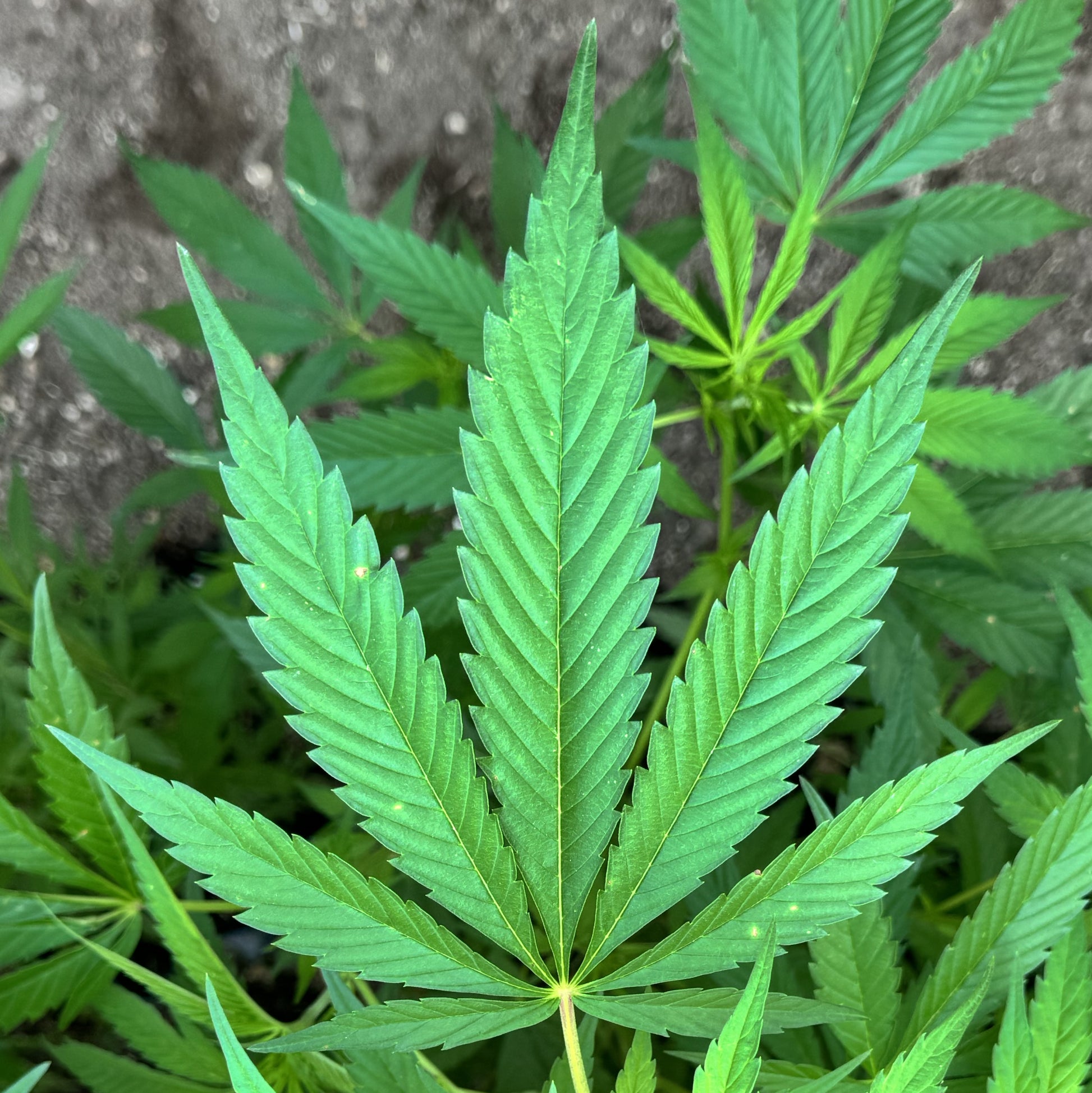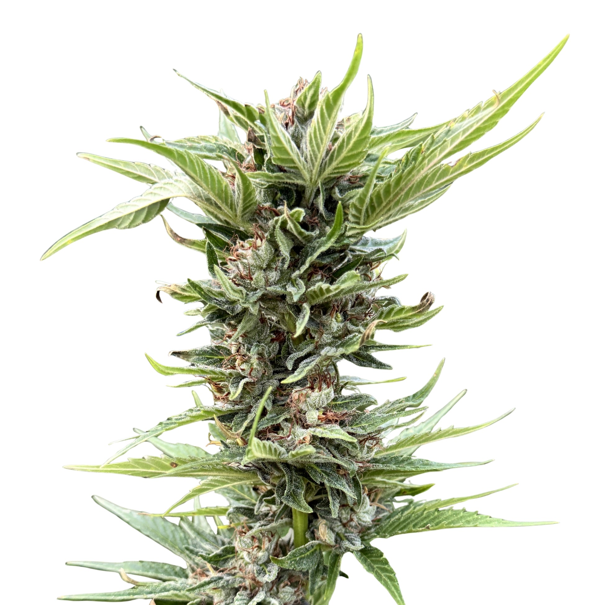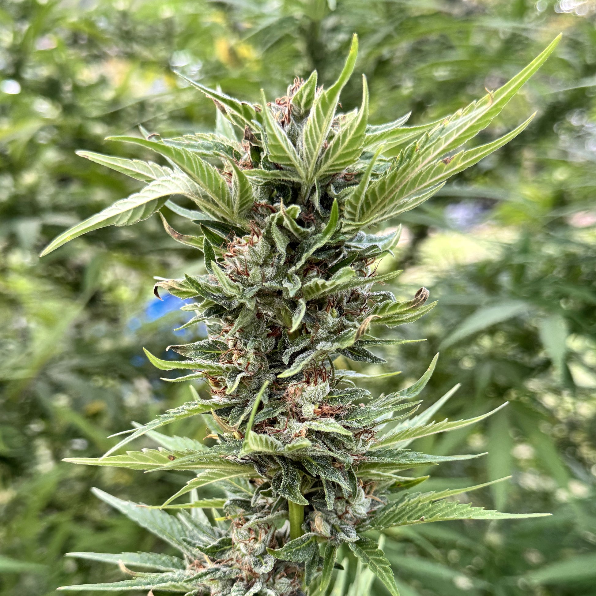 - Tall, open plants with Kona Gold influence: long internodes, narrow 7-blade leaves, and vigorous vertical stretch.